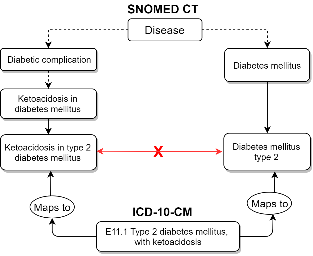 For example, in ICD-10-CM diabetic complications are a part of the disorder of Diabetes Mellitus, while in SNOMED Diabetes Mellitus and its complications reside in distinct hierarchical branches.