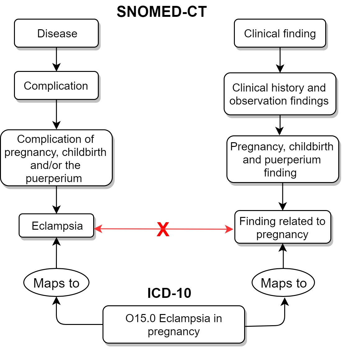 As another example, ICD-10 codes indicating complications of pregnancy are in the chapter of “Pregnancy, childbirth and the puerperium” that has a semantic relation to the fact of pregnancy, while in SNOMED denoting pregnancy conditions and their complications are in the separate hierarchical branches.